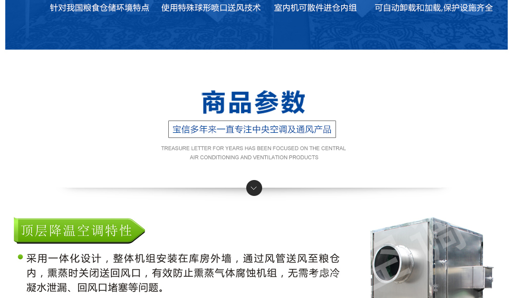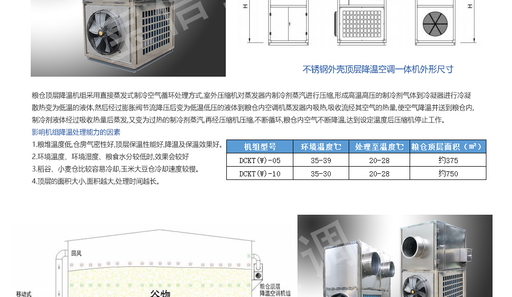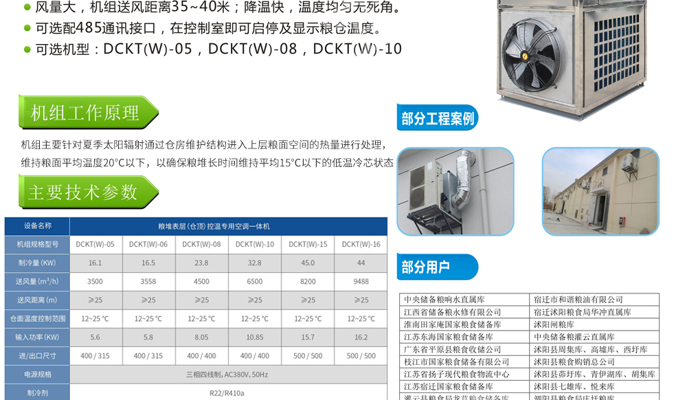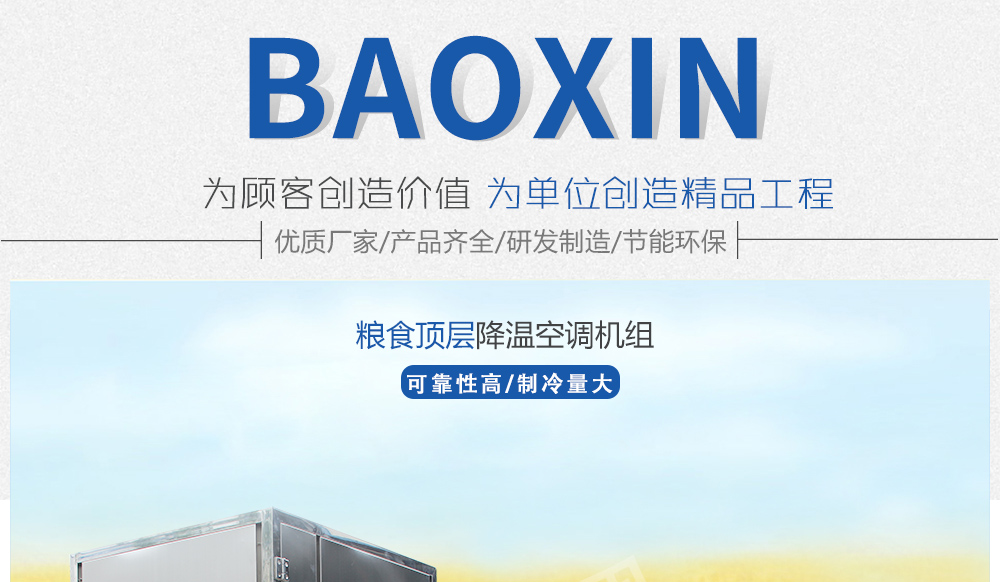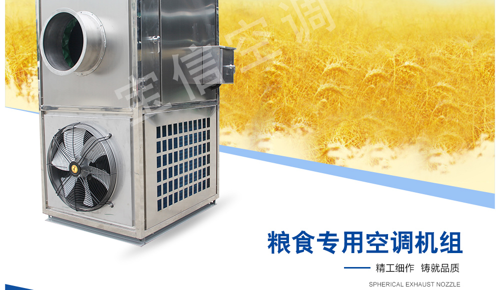 糧倉頂層降溫空調(diào)機組主要由風(fēng)冷制冷降溫系統(tǒng)、空氣循環(huán)系統(tǒng)、智能控制系統(tǒng)組成,主要是針對我國糧食倉儲環(huán)境特點和氣候特征綜合分析而特別設(shè)計的糧倉頂層降溫系統(tǒng),是各糧食儲備庫實現(xiàn)綠色儲糧、科學(xué)保糧目標(biāo)的重要保障手段,其性能達到國內(nèi)先進水平。