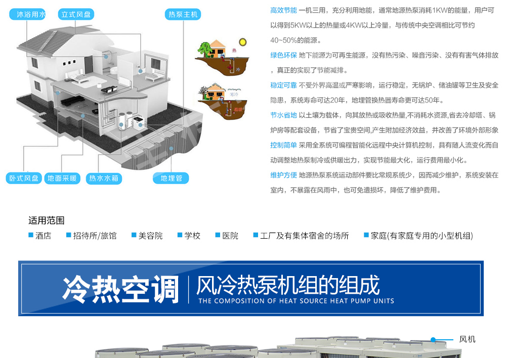 風(fēng)冷熱泵機(jī)組是由壓縮機(jī)——換熱器——節(jié)流器——吸熱器——壓縮機(jī)等裝置構(gòu)成的一個(gè)循環(huán)系統(tǒng)。冷媒在壓縮機(jī)的作用下在系統(tǒng)內(nèi)循環(huán)流動(dòng)。它在壓縮機(jī)內(nèi)完成氣態(tài)的升壓升溫過(guò)程(溫度高達(dá)100℃),它進(jìn)入換熱器后釋放出高溫?zé)崃考訜崴瑫r(shí)自己被冷卻并轉(zhuǎn)化為流液態(tài),當(dāng)它運(yùn)行到吸熱器后,液態(tài)迅速吸熱蒸發(fā)再次轉(zhuǎn)化為氣態(tài),同時(shí)溫度下降至零下20℃——30℃,這時(shí)吸熱器周邊的空氣就會(huì)源源不斷地將低溫?zé)崃總鬟f給冷媒。冷媒不斷地循環(huán)就實(shí)現(xiàn)了空氣中的低溫?zé)崃哭D(zhuǎn)變?yōu)楦邷責(zé)崃坎⒓訜崂渌^(guò)程。