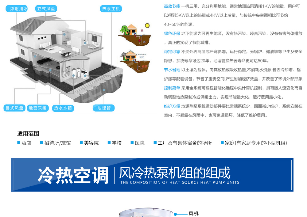 水/地源熱泵中央空調式我公司吸取世界各國地源熱泵產品精華,自主開發的新型供暖設備.該機組既保持與國外先進技術同步,又適應中國國情,是一種集制冷、供暖、供生活熱水為一體的高效節能的綠色環保中央空調。