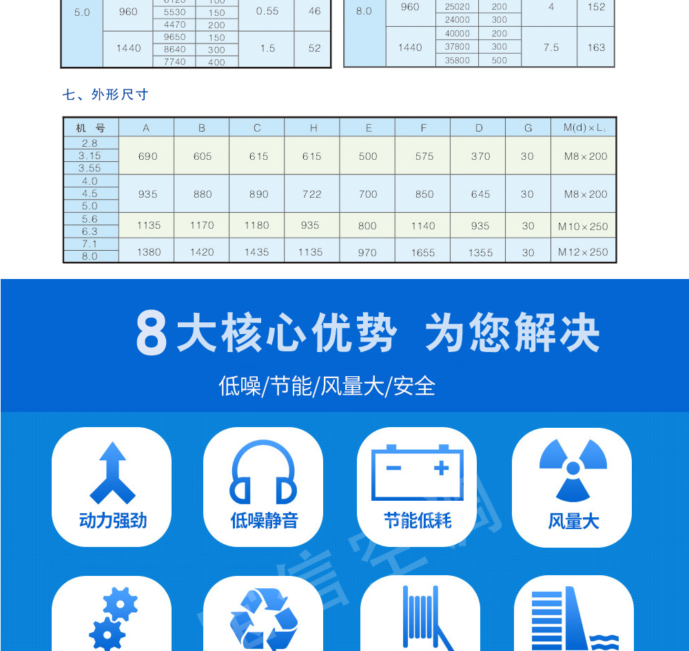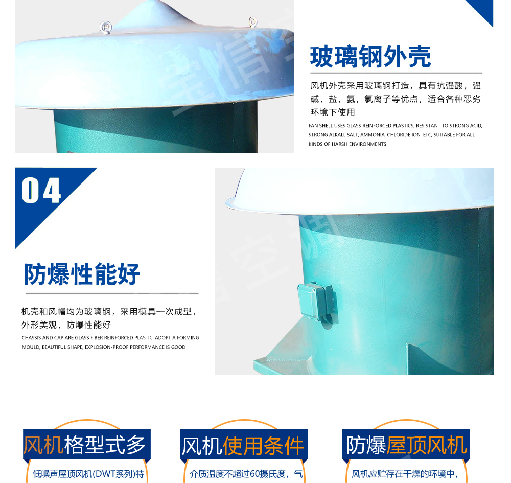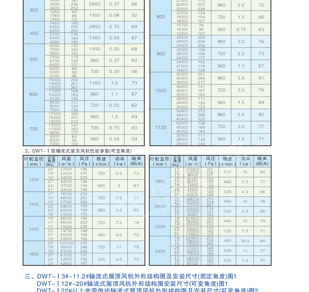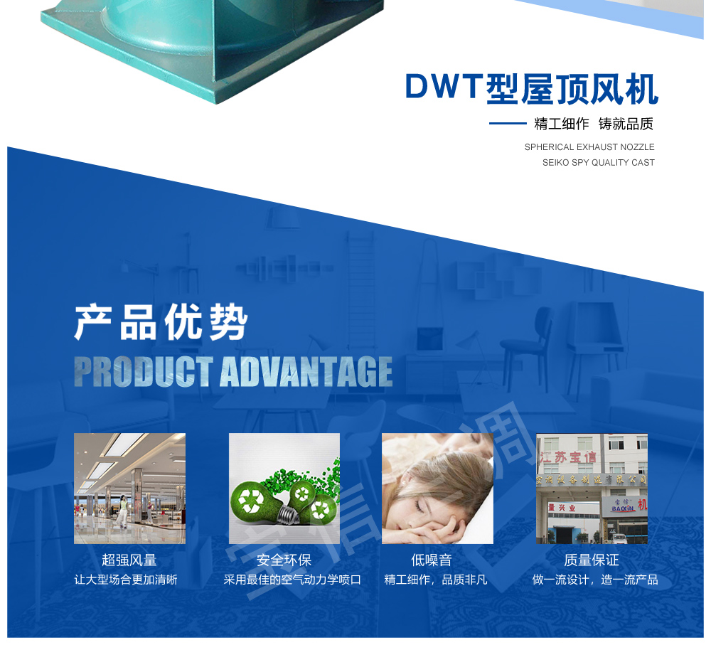 低噪聲屋頂風機(DWT系列)特點:格型式多,應用范圍廣:可根據使用場合壓力、風量和噪聲的不同要求,選用以下型式的風機:?