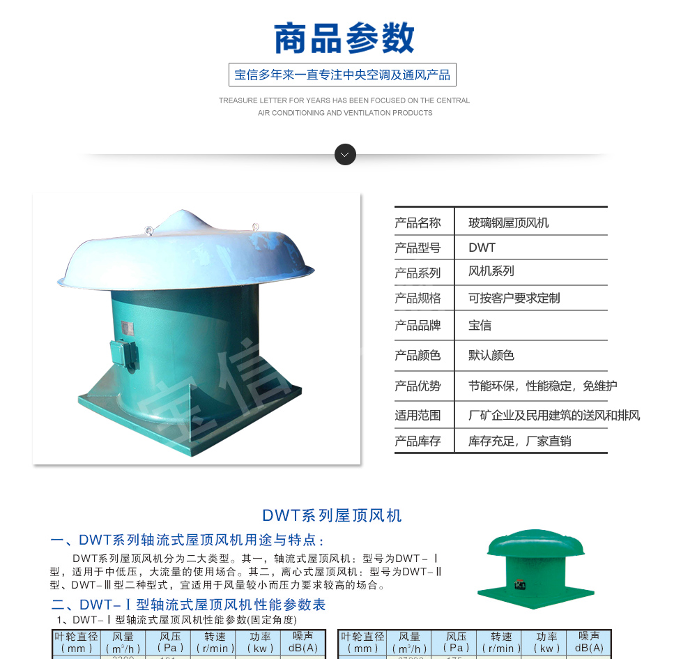 a、軸流式屋頂風機:型號為DWT-Ⅰ型,宜用于中低壓、大流量的使用場合。同時根據用戶需要還可以設計成雙向旋轉可逆式,具有正反工況等效的特點;?