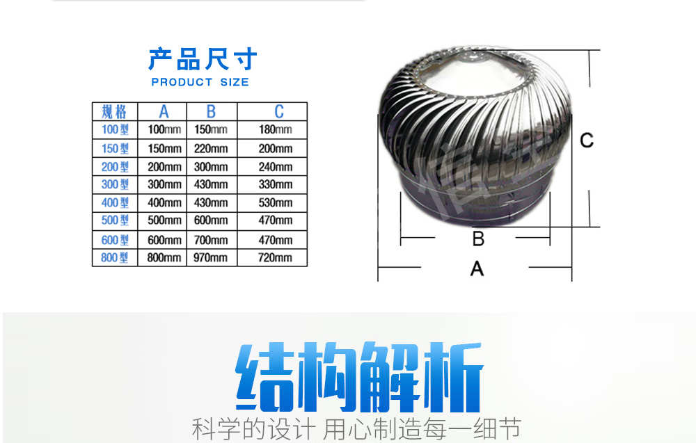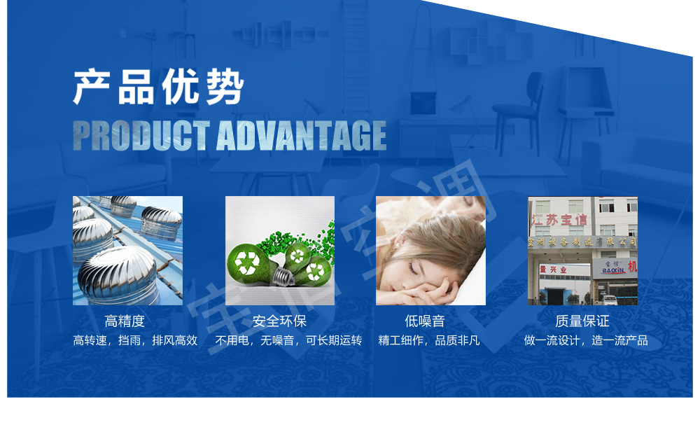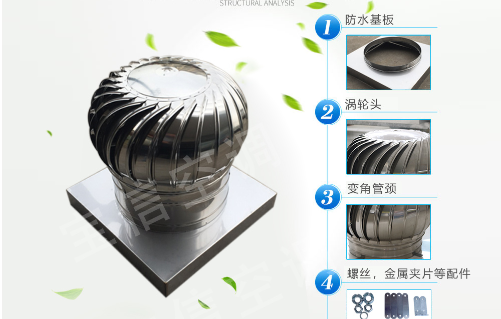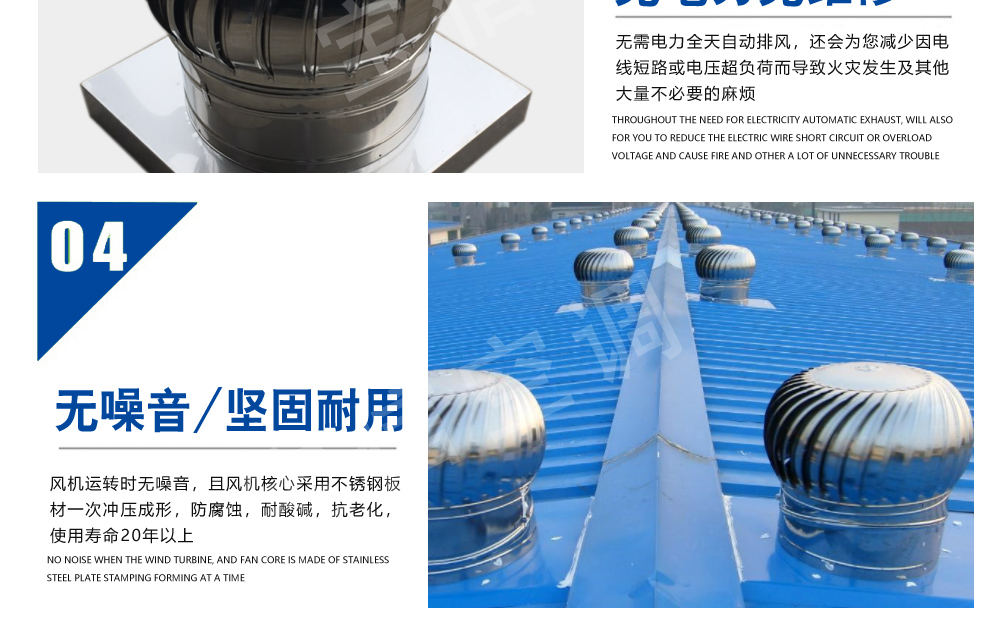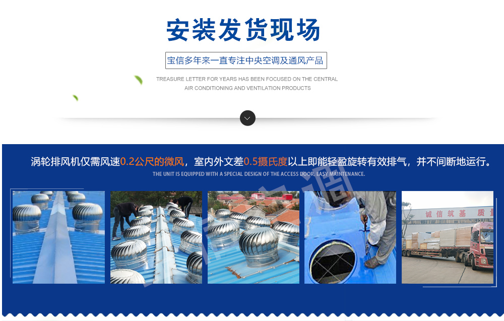 的原理,將任何平行方向的空氣流動,加速并轉變為由下而上垂直的空氣流動,以提高室內通風換氣效果的一種裝置。該風機不用電,無噪音,可長期運轉。其根據空氣自然規律和氣流流動原理,合理化設置在屋面的頂部,能迅速排出室內的
